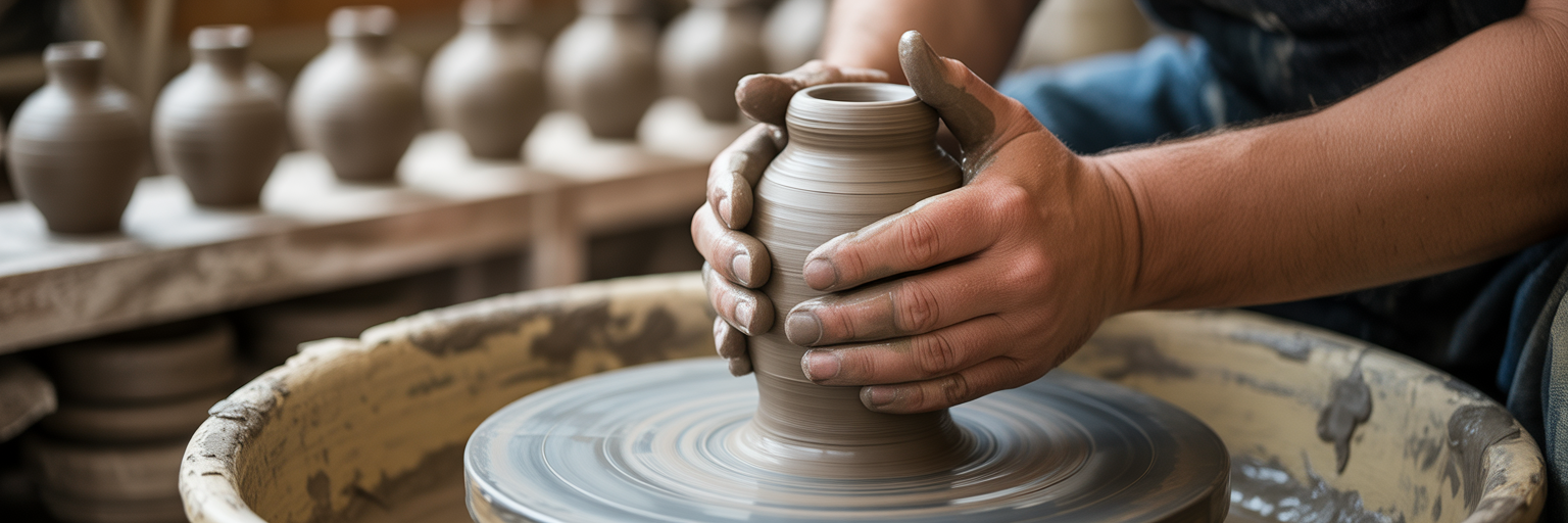 Potter's hands shaping clay pot.
